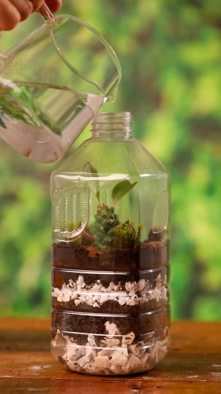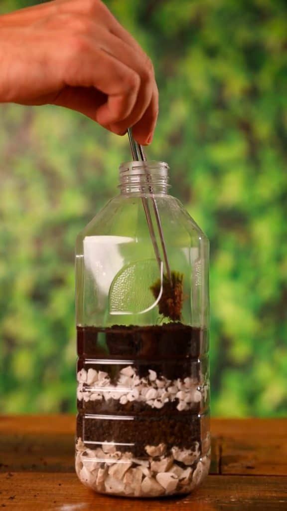 A luz do sol não pode incidir diretamente no terrário fechado, pois pode criar um “efeito-estufa” na garrafa e acabar prejudicando a vida das plantas. Esse tipo de terrário precisa de água borrifada ao menos a cada dois meses.