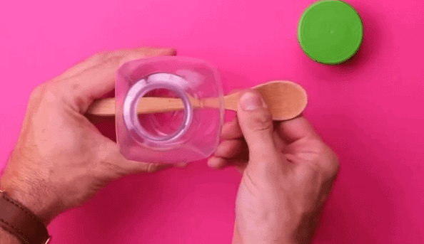 → Agora é hora de posicionar as colheres. Use a caneta marcadora para fazer quatro marcações, uma em cada lado da embalagem. Duas marcações devem ficar em uma altura, e duas em outra. Olhando a imagem você vai entender direitinho.